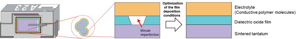 To achieve capacitor performance required for USB-PD 3.1 power supplies in a low-profile body, both high capacitance and a high withstand voltage must be ensured, despite their trade-off relationship. High-capacitance tantalum powder is necessary for electrode materials, but its fine particle size makes molding difficult, creating challenges for stable production. Forming a uniform dielectric film on the surface of the electrodes is important for enhancing the withstand voltage. However, since electrodes made with high-capacitance tantalum powder contain extremely small internal pores, dielectric oxide films tend to develop imperfections.