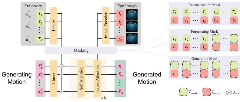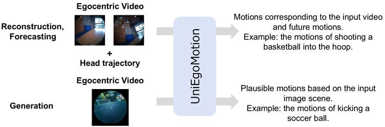 With the rise of first-person cameras and smart glasses capable of recording video, there is growing interest in technologies that can understand and predict human motions from the user’s own perspective. However, estimating motion from egocentric video or head trajectories alone has been technically challenging, often requiring additional third-person views or surrounding scene information, which has limited practical applications. Our newly developed approach, UniEgoMotion, overcomes these limitations by introducing a novel method that does not rely on third-person perspectives or surrounding scene information. UniEgoMotion enables highly accurate 3D motion reconstruction, forecasting, and generation solely from egocentric video and head trajectories (Figure 1).