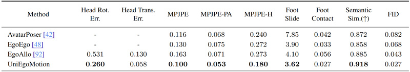 In our evaluation experiments, we compared UniEgoMotion with existing methods on the task of “motion reconstruction,” which estimates the current motion from egocentric video. UniEgoMotion achieved superior accuracy in pose reproduction and higher scores on metrics assessing the naturalness of motion, outperforming conventional approaches (Figure 3).