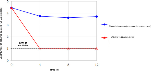 Exposure: Drop specified amount of liquid containing pertussis bacteria onto a petri dish in five designated spots (2 μL each, totaling 10 μL), and dry for approx. 60 minutes inside a biosafety cabinet. Place pertussis bacteria-attached samples 1.5 m away from the verification device (1.2 m above the floor).
