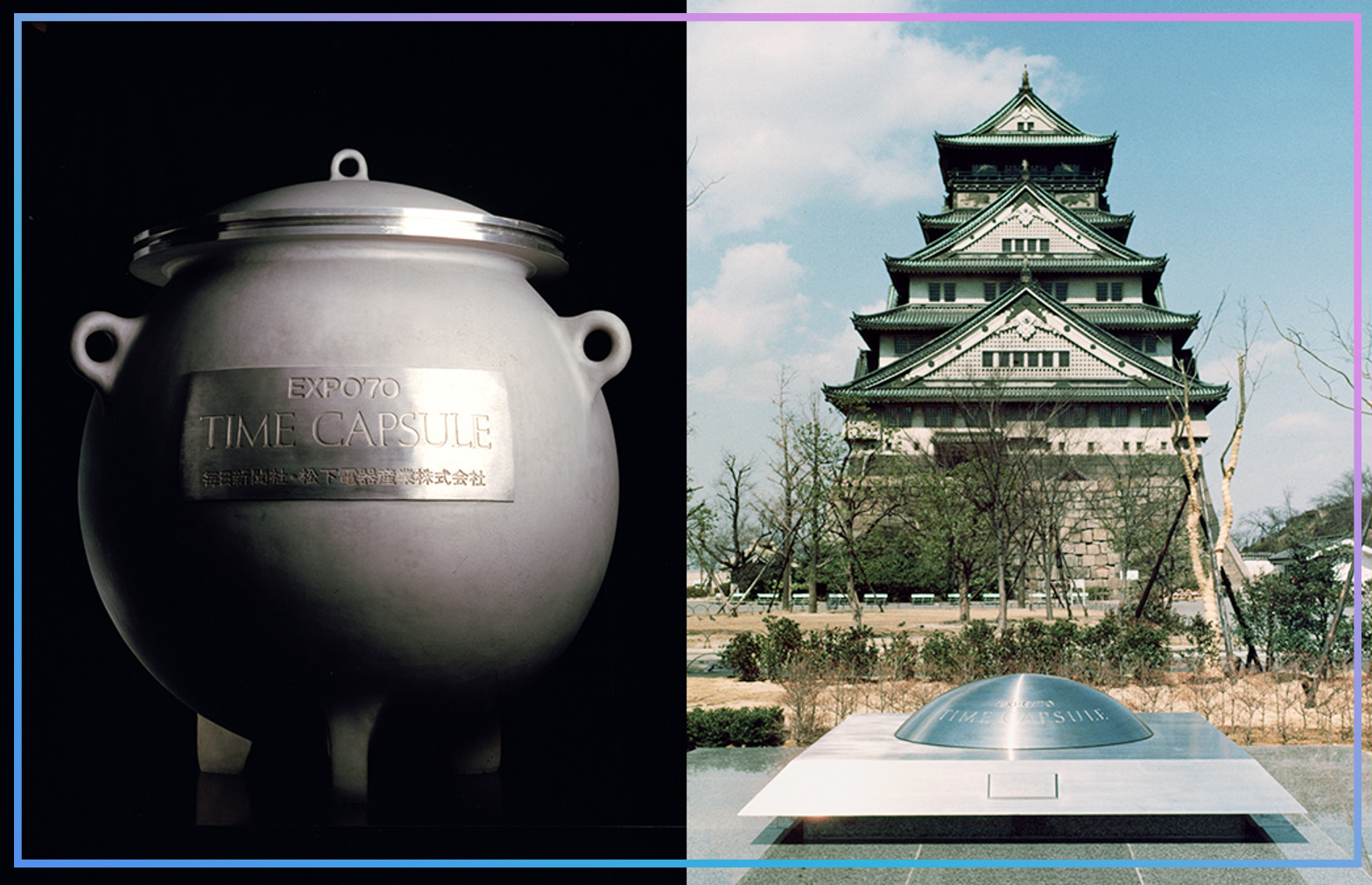 Time Capsule EXPO '70: This joint project between the Matsushita Group and Mainichi Newspapers saw two capsules containing 2,098 carefully selected objects buried on the grounds of Osaka Castle Park with the intention of sharing contemporary culture with future generations.
