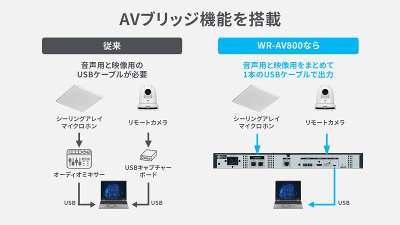 AVブリッジ機能により、従来は音声用と映像用に別々に必要だったUSBケーブルを、1本にまとめて出力できるようになりました。