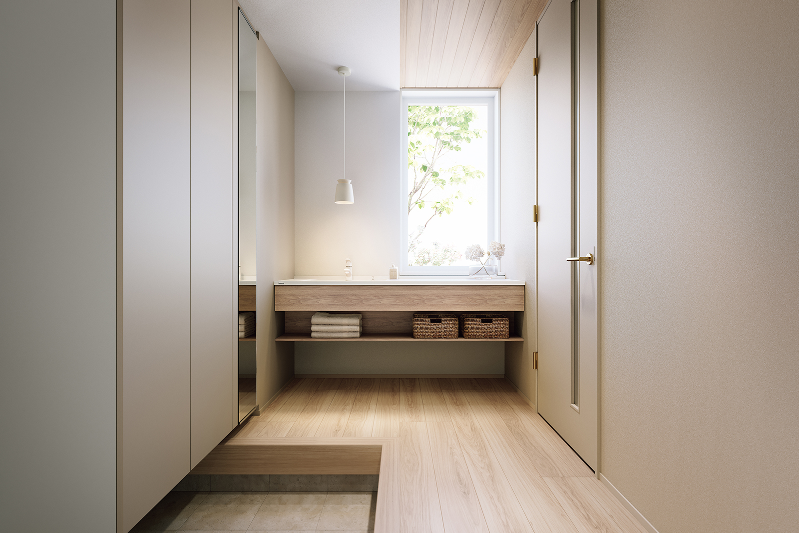 洗面化粧台を脱衣所に設置するという従来の慣習にとらわれず、日常生活において、家事、身支度、趣味、手洗いなど多用途に活用できるスペースとして提案します。例えばLDK空間の中に設置することで、身支度をスピーディーに快適に行える環境が整いますし、トイレに隣接して洗面化粧台を設ければトイレに手洗いは不要となり、そのコスト低減やスペースの有効活用が実現します。一方で、脱衣室と比べて、廊下やリビングなどは、建具やキッチンとのコーディネートが求められますが、新しいC-Lineでは昨今のトレンドを意識した扉柄を19柄から選ぶことができ、キッチンや建具とのトータルコーディネートが可能となります。