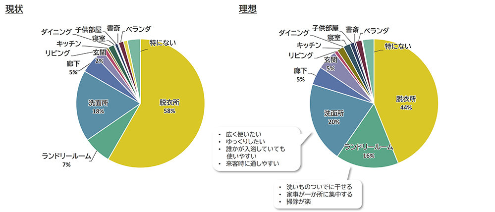 当社が実施した洗面台購入実態調査(※1)によると、洗面化粧台を置く場所については、現状、脱衣所が58%と過半数を超えていますが、利用者が理想とする洗面化粧台の置き場所はランドリールーム(※2)や洗面所(※3)、廊下や玄関などの脱衣所以外の割合が56%と現状の脱衣所の割合を逆転しており、脱衣所以外での洗面化粧台の使用ニーズが高まっていると言えます。また、当社の洗面化粧台では多用途に使えるように、十分な長さを確保した「ロングカウンター」や、洗面台の下の扉付きの収納スペースをあえてなくし、自由に使えるようにする「フロートプラン」の販売が増加傾向にあります。