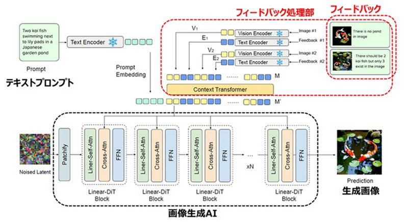 より短時間に高品質な画像を生成することを目指し、Reflect-Ditは生成された画像の改善点をテキスト形式で画像生成AIに直接フィードバックする技術を開発しました。具体的には画像生成AIの入力部分にフィードバック内容を処理するネットワークを新たに追加しました。(図1)生成された画像とテキストプロンプトを視覚言語モデル(VLM)が見比べて、改善点をテキストで記述し、画像生成AIに入力することで、AIが自らの生成結果を振り返り、次の生成に生かす自動改善ループを実現しました。(図2)