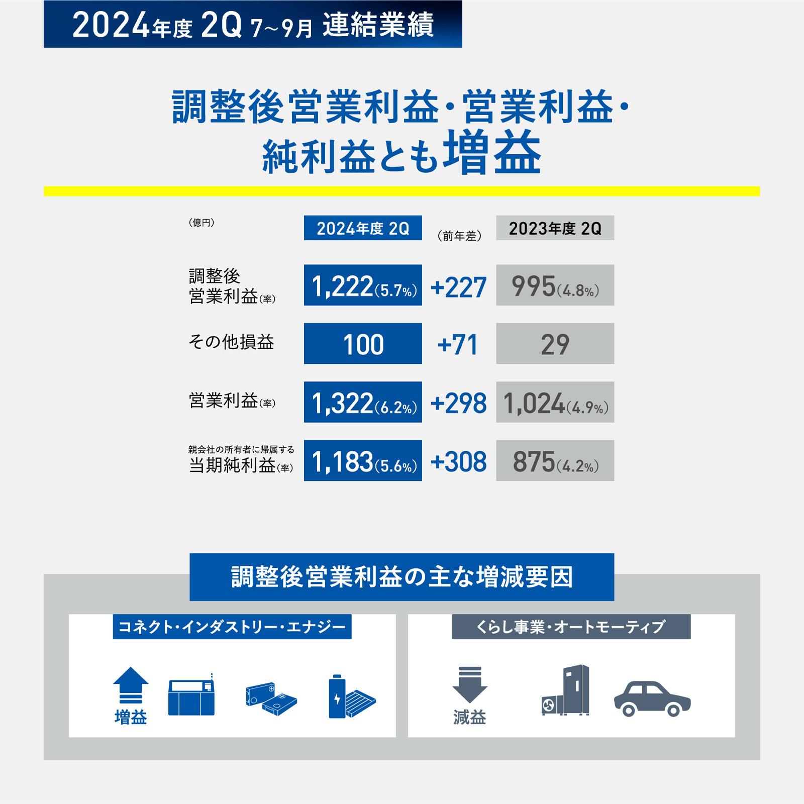 パナソニックグループは10月31日に2024年度 第2四半期の決算発表を行いました。本記事では、その概要をわかりやすくインフォグラフィックスで解説します。詳細の情報については、決算短信や決算プレゼンをご確認下さい。