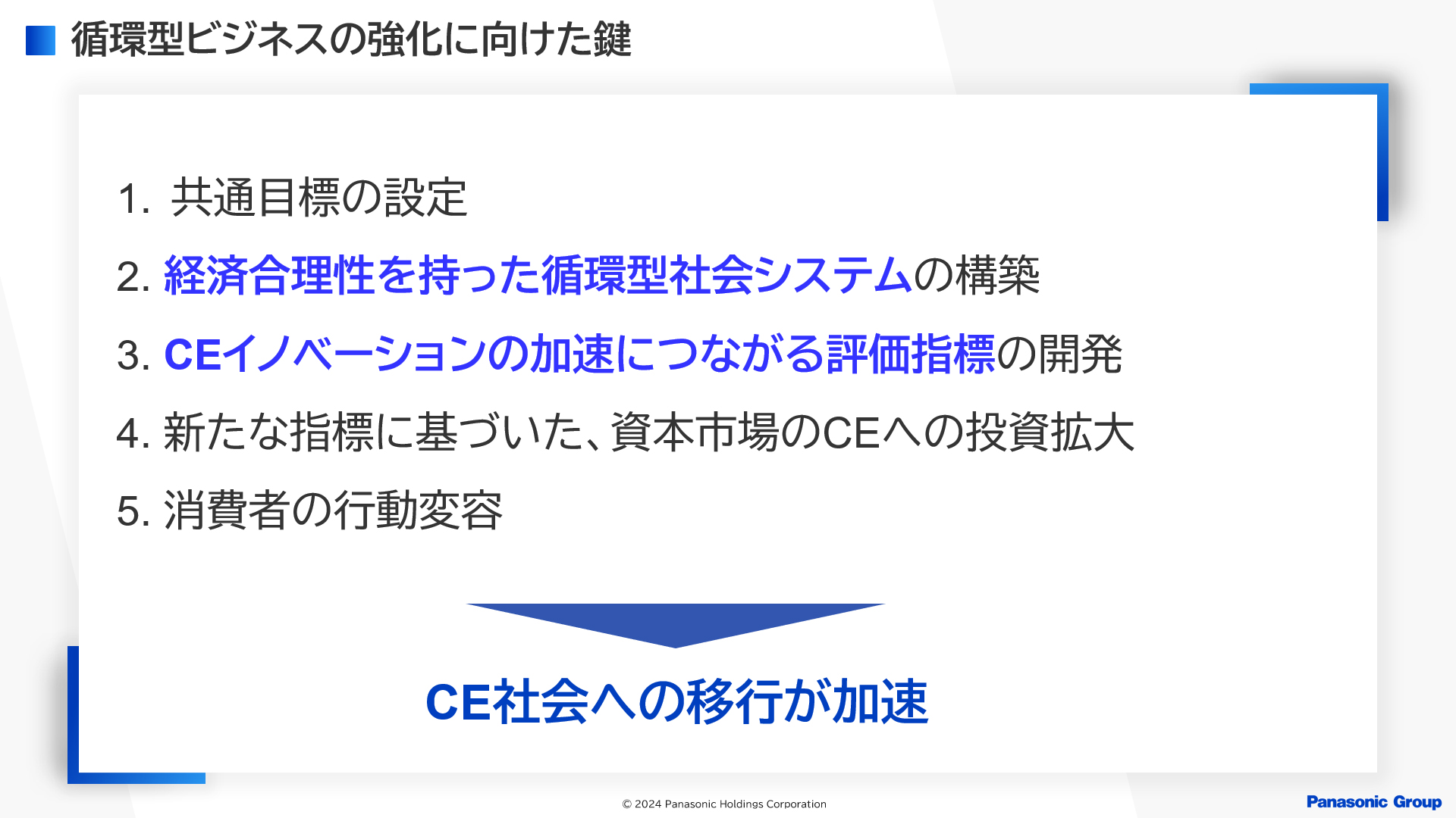 またWBCSDに加盟するパナソニックグループは、GCPの開発にも積極的に参画してきた。こうした活動を通じて、CE社会の実現に当たっては越えなくてはならないハードル・課題も浮かび上がりつつある。その点について上原は、「カーボンニュートラルと同様の、科学的根拠がある共通目標の設定」「経済合理性のあるCE型社会システムの構築」「イノベーションを加速する評価指標の整備」「資本市場の理解醸成」「消費者の行動変容」を挙げるとともに、「パナソニックグループは今後も、GCP開発の取り組みに積極的に参画することで、こうした課題の解決と、CE型社会への早期移行に貢献していく」と言及した。