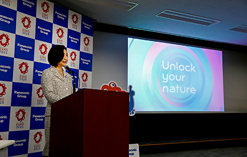 「Unlock your nature」の思いをマスメディアに説明する関西渉外・万博推進担当の小川参与。