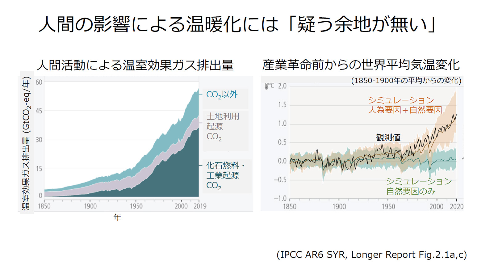 江守氏:足立さんの話を裏付けるデータがあります。この図のように、私たちは、過去10万年の中で最も暑い地球に生きています。専門家が見ても驚くほどの高温化が続いています。気温変化シミュレーションによると、化石燃料を燃やしながら生きている人間の活動によって温室効果ガスの排出量が増え、それが主な要因となって地球の温暖化が進んでいることは間違いありません。