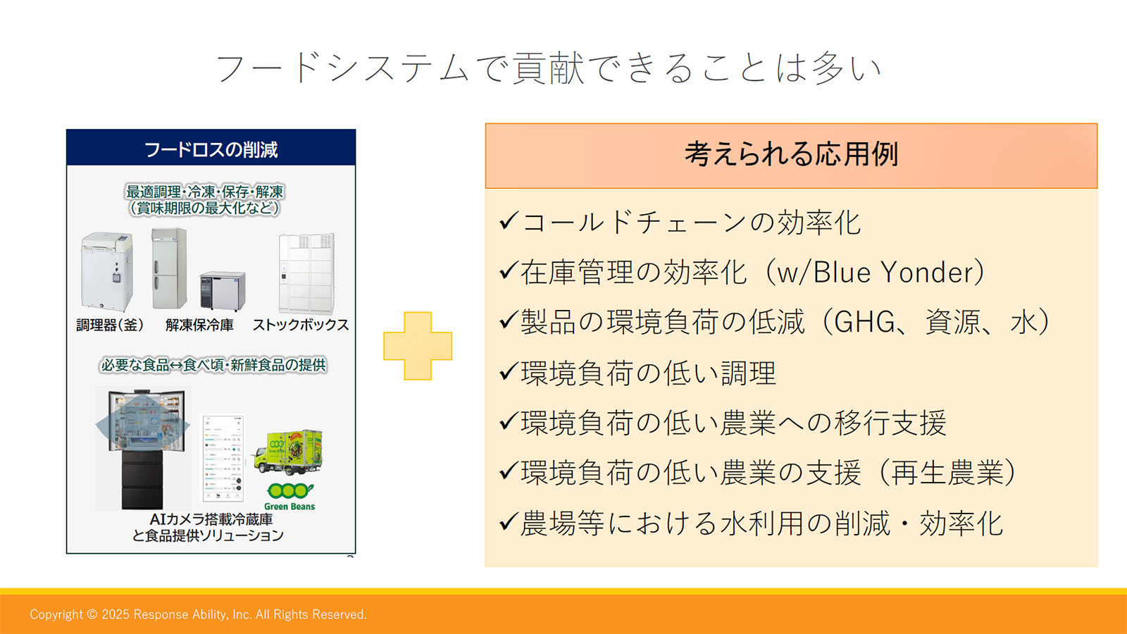 足立氏:食や農に関する領域では、フードシステム、特に農業や畜産業が地球にかけている負荷は意外に大きいのが現状です。温室効果ガスの排出量のうち最大3分の1を占めるとも言われています。パナソニックが冷凍冷蔵庫で培われた技術・サービスによって、フードロスの削減や、コールドチェーン領域での効率化実現、また環境負荷の低い農業の支援などに取り組めば、ネイチャーポジティブの実現に大きく貢献できることになります。