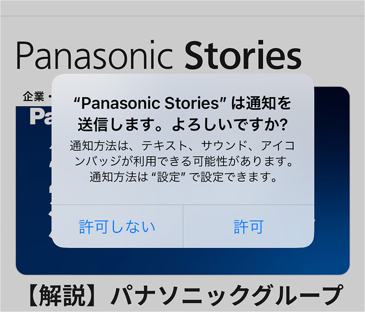 「"Panasonic Stories"は通知を送信します。よろしいですか?」のダイアログが表示されますので、「許可」をタップします。